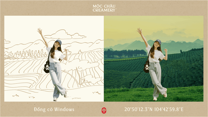 Tạo tấm bưu thiếp chia sẻ hành trình tại Mộc Châu bằng cách ghép bức ký họa cùng ảnh check-in của bạn.